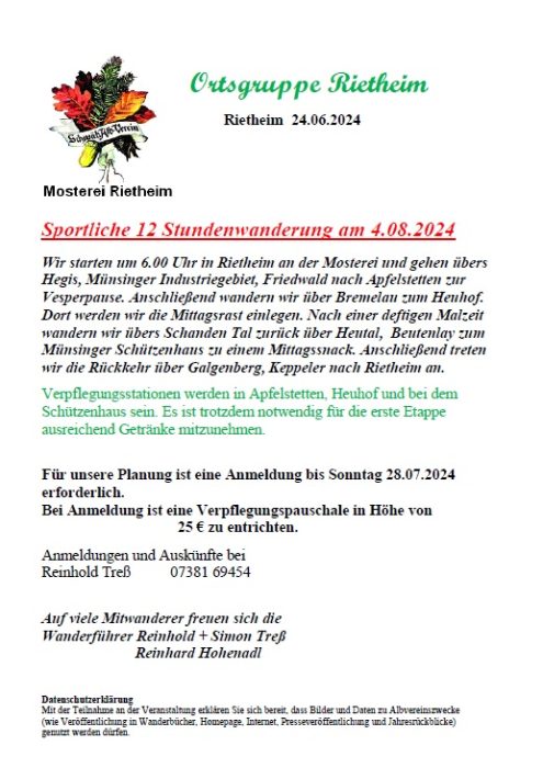 12 Stundenwanderung 6:00 Uhr So., 04.08.2024, Münsingen/Rietheim Uhrzeit: 06:00 Ort: Mosterei Münsinger Straße 58 72525 Münsingen/Rietheim iCalendar Mit dem Laden der Karte akzeptieren Sie die Datenschutzerklärung von Google.Mehr erfahren Karte laden Google Maps immer entsperren zur Übersicht