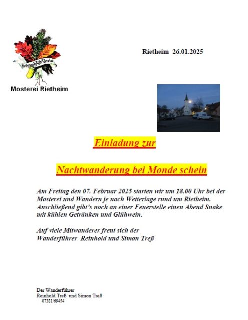 Nachtwanderung 18:00 Uhr Fr., 07.02.2025, Münsingen/Rietheim Uhrzeit: 00:00 Ort: Mosterei Münsinger Straße 58 72525 Münsingen/Rietheim iCalendar Mit dem Laden der Karte akzeptieren Sie die Datenschutzerklärung von Google.Mehr erfahren Karte laden Google Maps immer entsperren zur Übersicht
