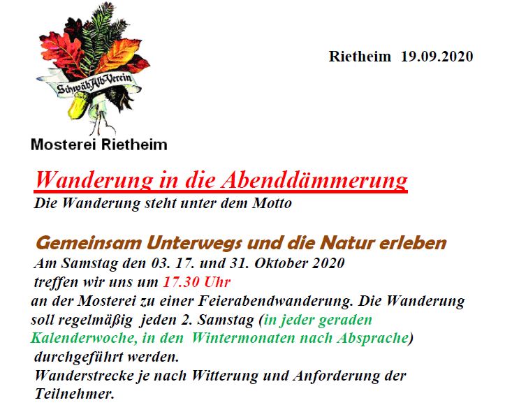 Wanderung in die Abenddämmereung 17:30 Uhr Sa., 03.10.2020, Münsingen/Rietheim Uhrzeit: Ganztägig Ort: Mosterei Münsinger Straße 58 72525 Münsingen/Rietheim iCalendar Mit dem Laden der Karte akzeptieren Sie die Datenschutzerklärung von Google.Mehr erfahren Karte laden Google Maps immer entsperren zur Übersicht