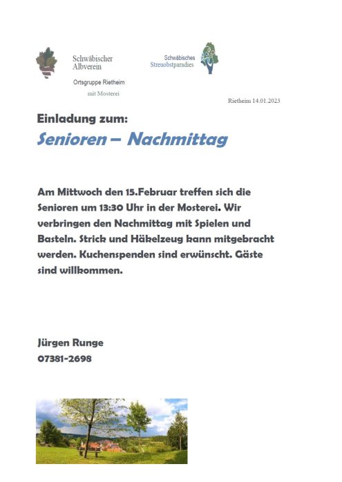 Senioren-Nachmittag Mi., 15.02.2023, Münsingen/Rietheim Uhrzeit: 00:00 Ort: Mosterei Münsinger Straße 58 72525 Münsingen/Rietheim iCalendar Mit dem Laden der Karte akzeptieren Sie die Datenschutzerklärung von Google.Mehr erfahren Karte laden Google Maps immer entsperren zur Übersicht