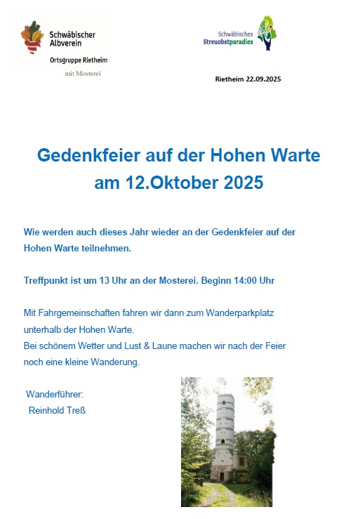 Gedenkfeier Hohe Warte 13.00 Uhr So., 12.10.2025, Münsingen/Rietheim 2025.09.12 Aushang für Hohe Warte Uhrzeit: 00:00 Ort: Mosterei Münsinger Straße 58 72525 Münsingen/Rietheim iCalendar Mit dem Laden der Karte akzeptieren Sie die Datenschutzerklärung von Google.Mehr erfahren Karte laden Google Maps immer entsperren zur Übersicht
