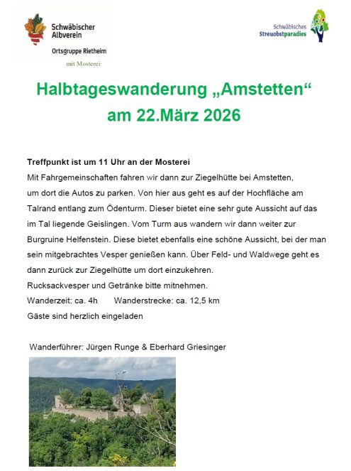 Halbtageswanderung „Amstetten“ 11:00 Uhr So., 22.03.2026, Münsingen/Rietheim Uhrzeit: 00:00 Ort: Mosterei Münsinger Straße 58 72525 Münsingen/Rietheim iCalendar Mit dem Laden der Karte akzeptieren Sie die Datenschutzerklärung von Google.Mehr erfahren Karte laden Google Maps immer entsperren zur Übersicht