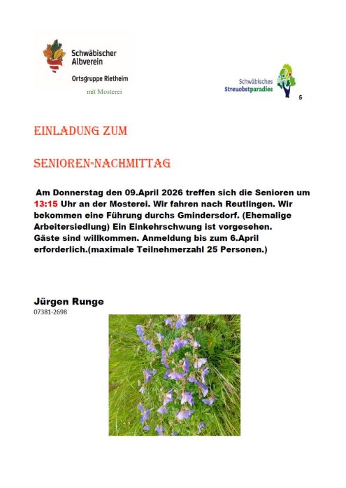 Senioren-Nachmittag 13:15 Uhr Do., 09.04.2026, Münsingen/Rietheim Uhrzeit: 00:00 Ort: Mosterei Münsinger Straße 58 72525 Münsingen/Rietheim iCalendar Mit dem Laden der Karte akzeptieren Sie die Datenschutzerklärung von Google.Mehr erfahren Karte laden Google Maps immer entsperren zur Übersicht