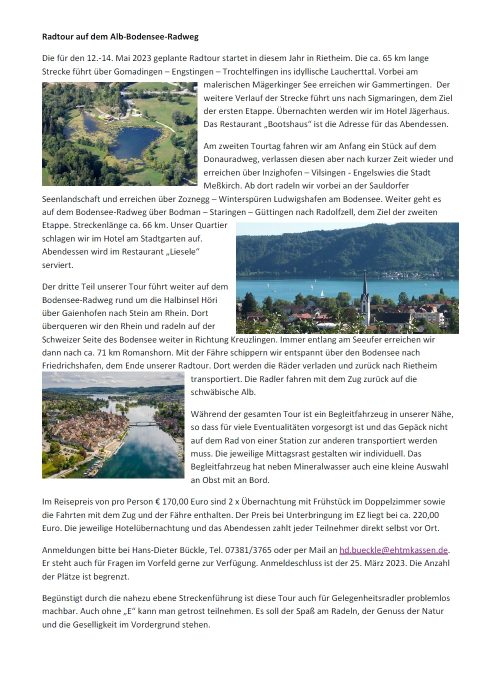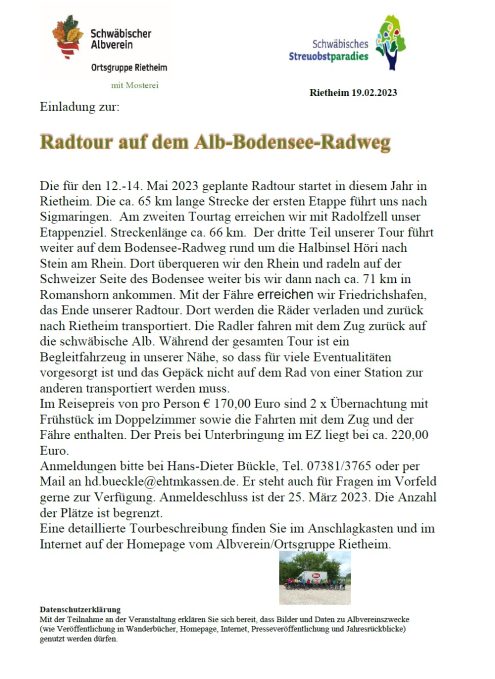 Bodensee Radtour Fr., 12.05.2023 - So., 14.05.2023, Münsingen/Rietheim Uhrzeit: 00:00 Ort: Mosterei Münsinger Straße 58 72525 Münsingen/Rietheim iCalendar Mit dem Laden der Karte akzeptieren Sie die Datenschutzerklärung von Google.Mehr erfahren Karte laden Google Maps immer entsperren zur Übersicht