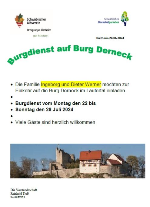 Burgdienst Derneck Mo., 22.07.2024 - So., 28.07.2024, Münzdorf Uhrzeit: 00:00 Ort: Burg Derneck Schlosshalde 1 72534 Münzdorf iCalendar Mit dem Laden der Karte akzeptieren Sie die Datenschutzerklärung von Google.Mehr erfahren Karte laden Google Maps immer entsperren zur Übersicht