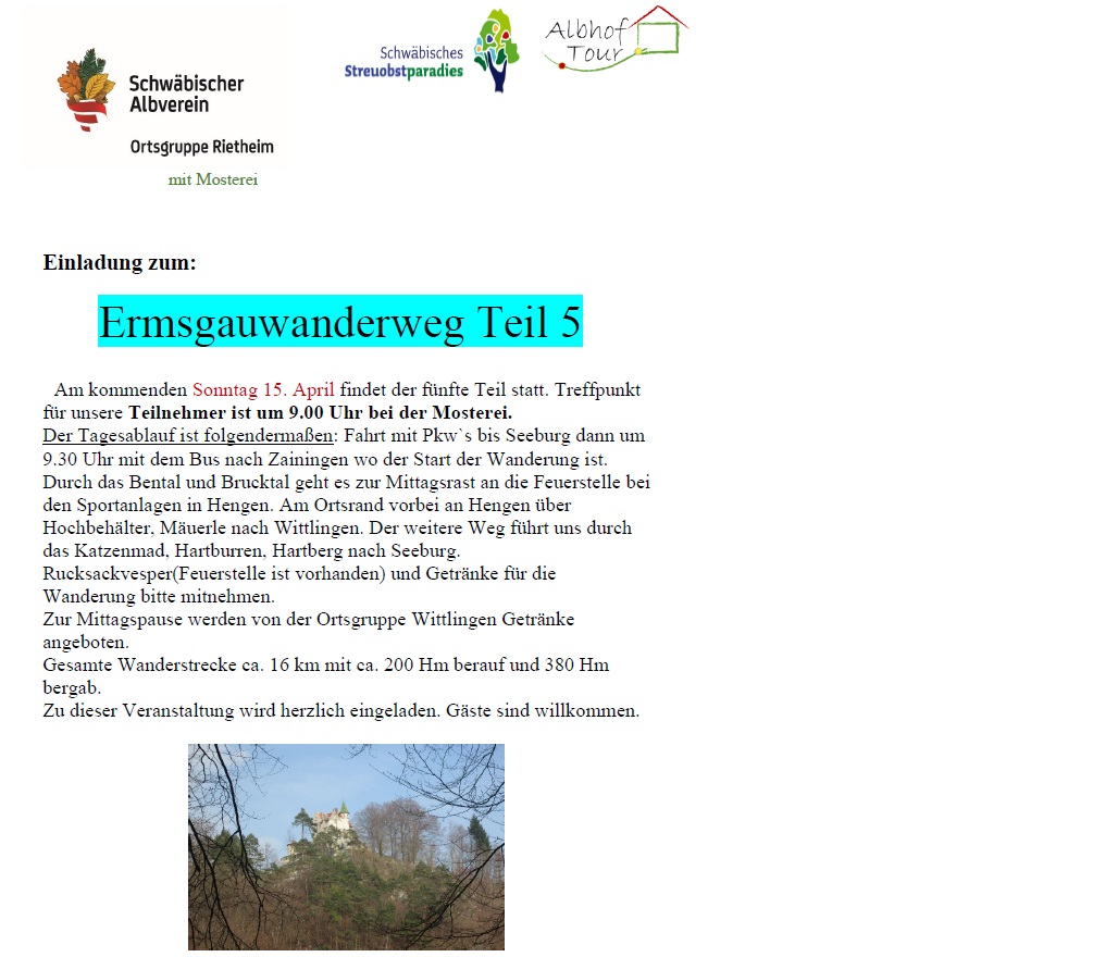 Ermsgauwanderweg Teil5 So., 15.04.2018, Münsingen/Rietheim Uhrzeit: 00:00 Ort: Mosterei Münsinger Straße 58 72525 Münsingen/Rietheim iCalendar Mit dem Laden der Karte akzeptieren Sie die Datenschutzerklärung von Google.Mehr erfahren Karte laden Google Maps immer entsperren zur Übersicht