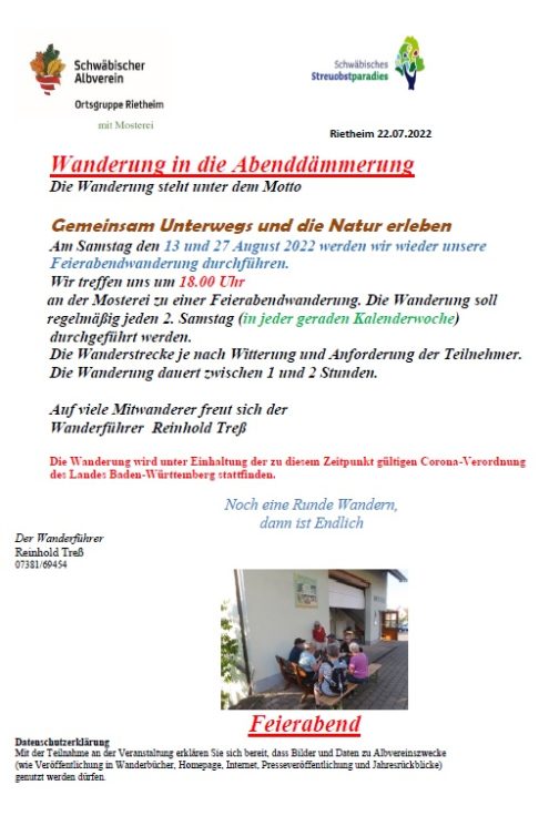 Wanderung in die Abenddämmerung 18:00 Uhr Sa., 27.08.2022, Münsingen/Rietheim Uhrzeit: 00:00 Ort: Mosterei Münsinger Straße 58 72525 Münsingen/Rietheim iCalendar Mit dem Laden der Karte akzeptieren Sie die Datenschutzerklärung von Google.Mehr erfahren Karte laden Google Maps immer entsperren zur Übersicht