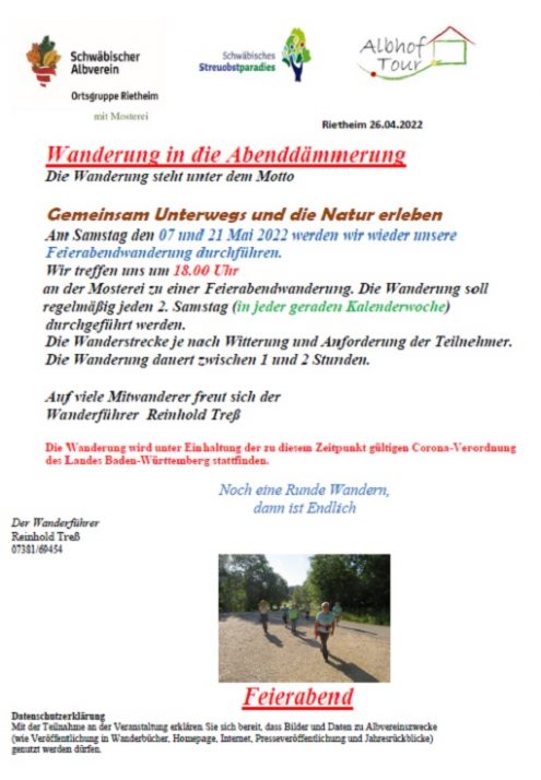 Feierabend Wanderung 18:00 Uhr Sa., 07.05.2022, Münsingen/Rietheim Uhrzeit: Ganztägig Ort: Mosterei Münsinger Straße 58 72525 Münsingen/Rietheim iCalendar Mit dem Laden der Karte akzeptieren Sie die Datenschutzerklärung von Google.Mehr erfahren Karte laden Google Maps immer entsperren zur Übersicht