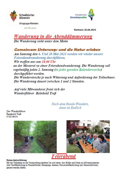Feierabend Wanderung 18:00 Uhr Sa., 20.05.2023, Münsingen/Rietheim Uhrzeit: 00:00 Ort: Mosterei Münsinger Straße 58 72525 Münsingen/Rietheim iCalendar Mit dem Laden der Karte akzeptieren Sie die Datenschutzerklärung von Google.Mehr erfahren Karte laden Google Maps immer entsperren zur Übersicht