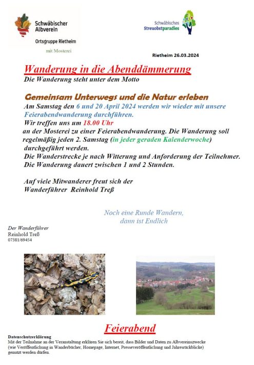 Feierabend Wanderung 18:00 Uhr Sa., 20.04.2024, Münsingen/Rietheim Uhrzeit: 00:00 Ort: Mosterei Münsinger Straße 58 72525 Münsingen/Rietheim iCalendar Mit dem Laden der Karte akzeptieren Sie die Datenschutzerklärung von Google.Mehr erfahren Karte laden Google Maps immer entsperren zur Übersicht