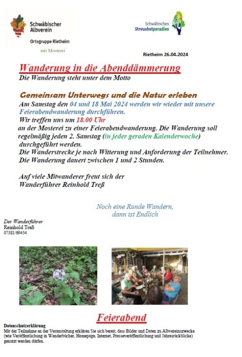 Feierabend Wanderung 18:00 Uhr Sa., 18.05.2024, Münsingen/Rietheim Uhrzeit: 00:00 Ort: Mosterei Münsinger Straße 58 72525 Münsingen/Rietheim iCalendar Mit dem Laden der Karte akzeptieren Sie die Datenschutzerklärung von Google.Mehr erfahren Karte laden Google Maps immer entsperren zur Übersicht