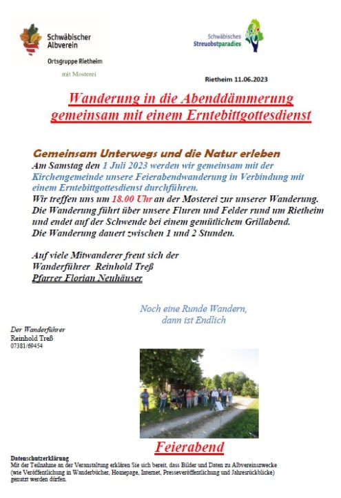 Feierabendwanderun mit Erntebittstunde 18:00 Uhr Sa., 01.07.2023, Münsingen/Rietheim Uhrzeit: 00:00 Ort: Mosterei Münsinger Straße 58 72525 Münsingen/Rietheim iCalendar Mit dem Laden der Karte akzeptieren Sie die Datenschutzerklärung von Google.Mehr erfahren Karte laden Google Maps immer entsperren zur Übersicht
