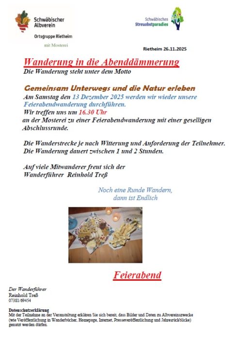 Feierabendwanderung 16:30 Uhr Sa., 13.12.2025, Münsingen/Rietheim Feierabendwanderung 2025.12.13 Uhrzeit: 00:00 Ort: Mosterei Münsinger Straße 58 72525 Münsingen/Rietheim iCalendar Mit dem Laden der Karte akzeptieren Sie die Datenschutzerklärung von Google.Mehr erfahren Karte laden Google Maps immer entsperren zur Übersicht
