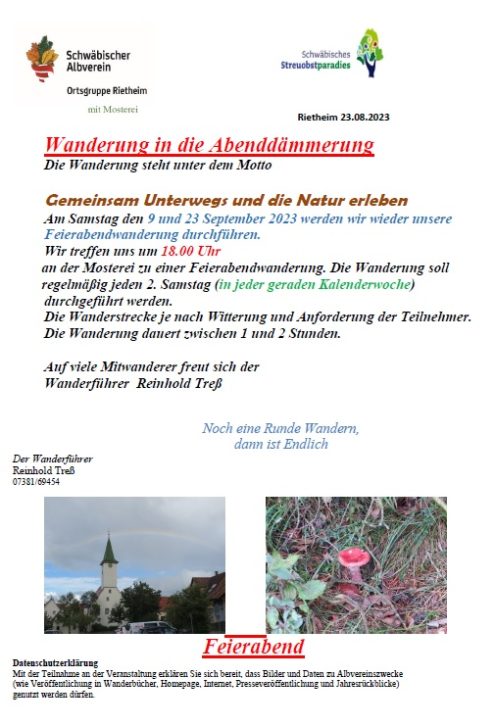 Feierabendwanderung 18:00 Uhr Sa., 09.09.2023, Münsingen/Rietheim Uhrzeit: 00:00 Ort: Mosterei Münsinger Straße 58 72525 Münsingen/Rietheim iCalendar Mit dem Laden der Karte akzeptieren Sie die Datenschutzerklärung von Google.Mehr erfahren Karte laden Google Maps immer entsperren zur Übersicht