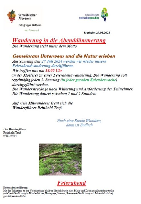 Feierabendwanderung 18:00 Uhr Sa., 27.07.2024, Münsingen/Rietheim Uhrzeit: 00:00 Ort: Mosterei Münsinger Straße 58 72525 Münsingen/Rietheim iCalendar Mit dem Laden der Karte akzeptieren Sie die Datenschutzerklärung von Google.Mehr erfahren Karte laden Google Maps immer entsperren zur Übersicht