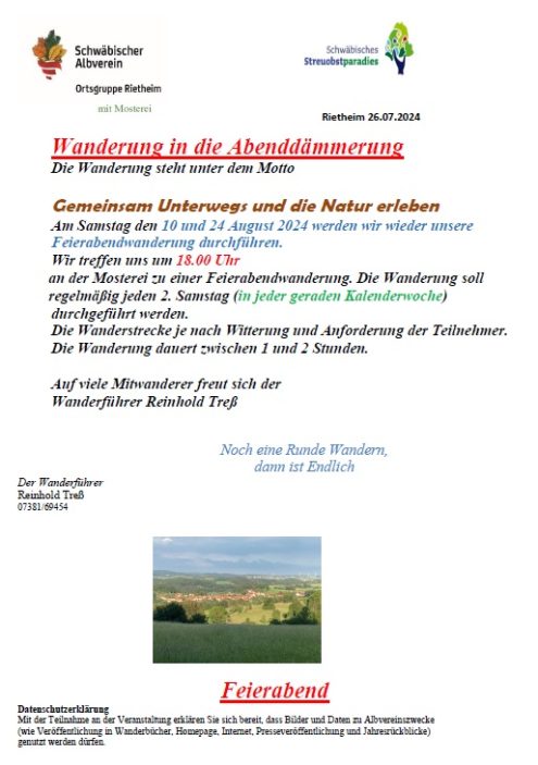 Feierabendwanderung 18:00 Uhr Sa., 24.08.2024, Münsingen/Rietheim Uhrzeit: 00:00 Ort: Mosterei Münsinger Straße 58 72525 Münsingen/Rietheim iCalendar Mit dem Laden der Karte akzeptieren Sie die Datenschutzerklärung von Google.Mehr erfahren Karte laden Google Maps immer entsperren zur Übersicht
