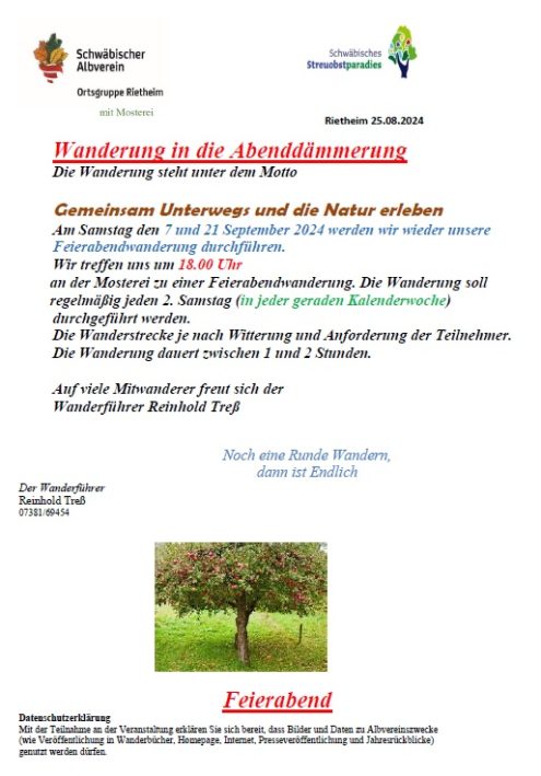 Feierabendwanderung 18:00 Uhr Sa., 21.09.2024, Münsingen/Rietheim Uhrzeit: 00:00 Ort: Mosterei Münsinger Straße 58 72525 Münsingen/Rietheim iCalendar Mit dem Laden der Karte akzeptieren Sie die Datenschutzerklärung von Google.Mehr erfahren Karte laden Google Maps immer entsperren zur Übersicht