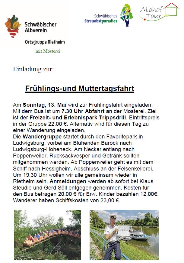 Frühlings- und Muttertagsfahrt So., 13.05.2018, Münsingen/Rietheim Uhrzeit: 00:00 Ort: Mosterei Münsinger Straße 58 72525 Münsingen/Rietheim iCalendar Mit dem Laden der Karte akzeptieren Sie die Datenschutzerklärung von Google.Mehr erfahren Karte laden Google Maps immer entsperren zur Übersicht