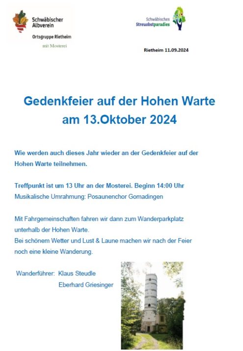 Gedenkfeier Hohe Warte 13:00 Uhr Treffpunkt So., 13.10.2024, Münsingen/Rietheim Uhrzeit: 00:00 Ort: Mosterei Münsinger Straße 58 72525 Münsingen/Rietheim iCalendar Mit dem Laden der Karte akzeptieren Sie die Datenschutzerklärung von Google.Mehr erfahren Karte laden Google Maps immer entsperren zur Übersicht