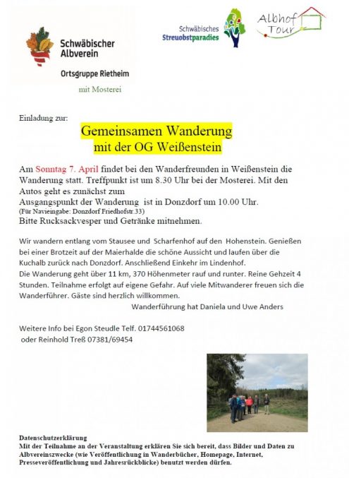 Gemeinsame Wanderung mit der OG Weißenstein 8:30 Uhr So., 07.04.2019, Münsingen/Rietheim Uhrzeit: 00:00 Ort: Mosterei Münsinger Straße 58 72525 Münsingen/Rietheim iCalendar Mit dem Laden der Karte akzeptieren Sie die Datenschutzerklärung von Google.Mehr erfahren Karte laden Google Maps immer entsperren zur Übersicht