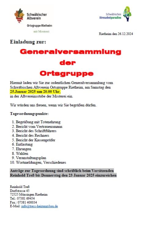 Hauptversammlung 20:00 Uhr Sa., 25.01.2025, Münsingen/Rietheim Uhrzeit: 00:00 Ort: Albvereins-Stube Rietheim Münsingerstr. 72525 Münsingen/Rietheim iCalendar Mit dem Laden der Karte akzeptieren Sie die Datenschutzerklärung von Google.Mehr erfahren Karte laden Google Maps immer entsperren zur Übersicht