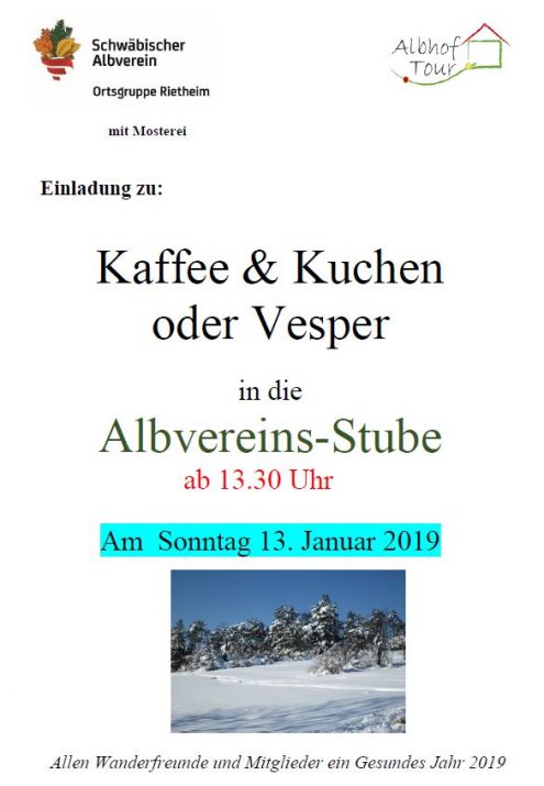Kaffee & Kuchen oder Vesper in der Albvereins-Stube So., 13.01.2019, Münsingen/Rietheim Uhrzeit: 00:00 Ort: Albvereins-Stube Rietheim Münsingerstr. 72525 Münsingen/Rietheim iCalendar Mit dem Laden der Karte akzeptieren Sie die Datenschutzerklärung von Google.Mehr erfahren Karte laden Google Maps immer entsperren zur Übersicht
