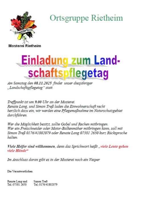 Landschaftspflegetag 9:00 Uhr Sa., 08.11.2025, Münsingen/Rietheim Uhrzeit: 00:00 Ort: Mosterei Münsinger Straße 58 72525 Münsingen/Rietheim iCalendar Mit dem Laden der Karte akzeptieren Sie die Datenschutzerklärung von Google.Mehr erfahren Karte laden Google Maps immer entsperren zur Übersicht