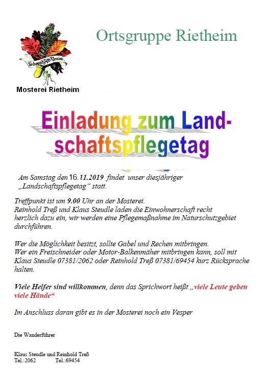 Landschaftspflegetag 9:00 Uhr Sa., 16.11.2019, Münsingen/Rietheim Uhrzeit: Ganztägig Ort: Mosterei Münsinger Straße 58 72525 Münsingen/Rietheim iCalendar Mit dem Laden der Karte akzeptieren Sie die Datenschutzerklärung von Google.Mehr erfahren Karte laden Google Maps immer entsperren zur Übersicht