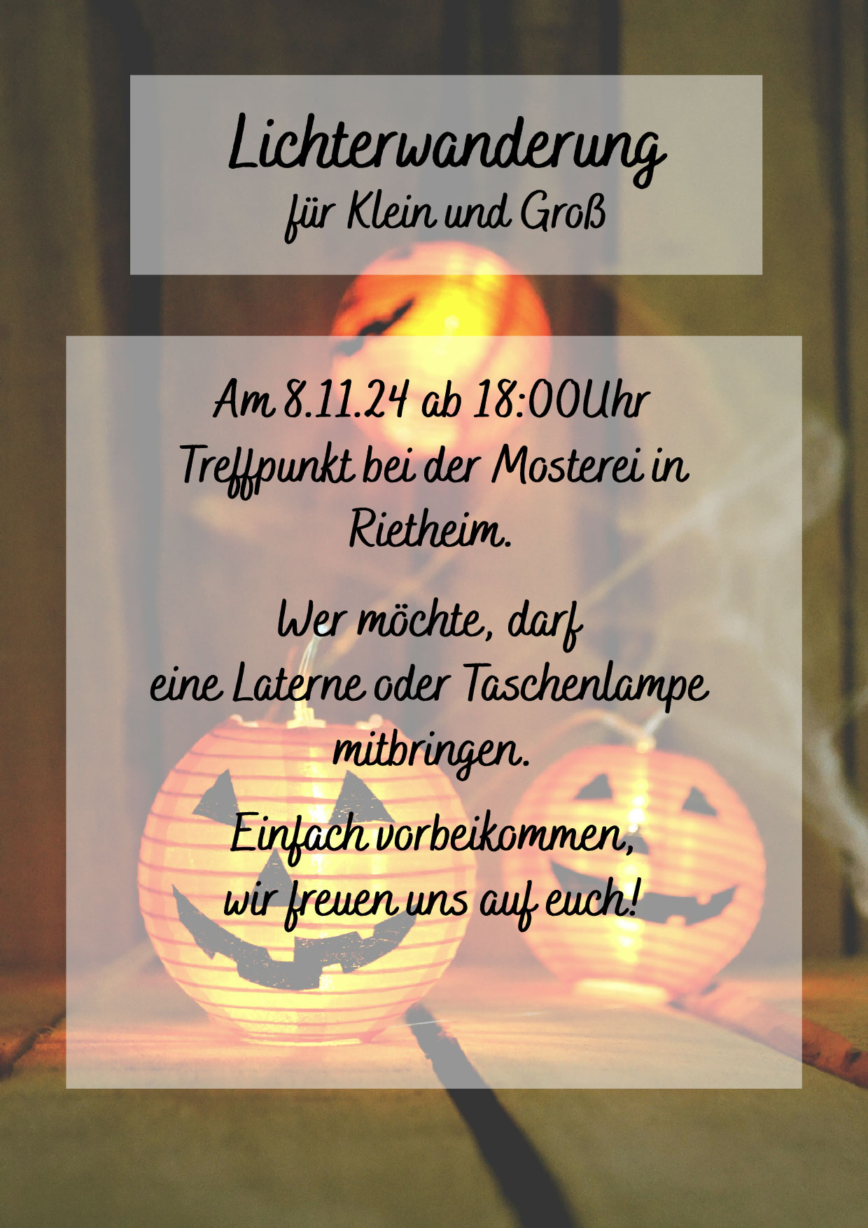 Lichterwanderung für Klein und Groß 18:00 Uhr Fr., 08.11.2024, Münsingen/Rietheim Uhrzeit: 00:00 Ort: Mosterei Münsinger Straße 58 72525 Münsingen/Rietheim iCalendar Mit dem Laden der Karte akzeptieren Sie die Datenschutzerklärung von Google.Mehr erfahren Karte laden Google Maps immer entsperren zur Übersicht