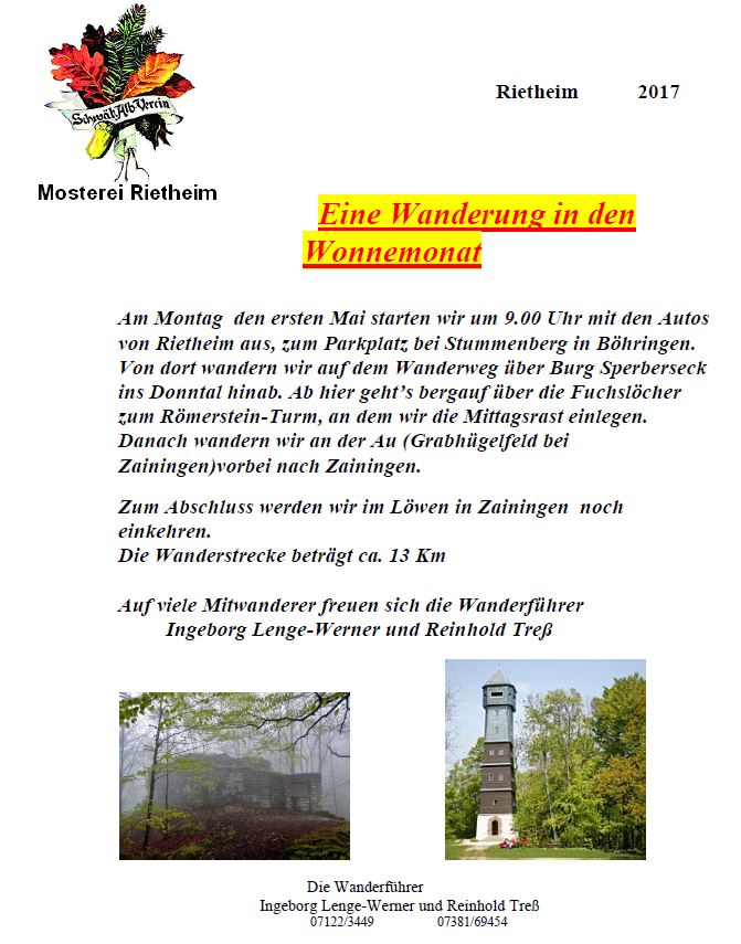 Maiwanderung Mo., 01.05.2017, Münsingen/Rietheim Uhrzeit: 00:00 Ort: Mosterei Münsinger Straße 58 72525 Münsingen/Rietheim iCalendar Mit dem Laden der Karte akzeptieren Sie die Datenschutzerklärung von Google.Mehr erfahren Karte laden Google Maps immer entsperren zur Übersicht