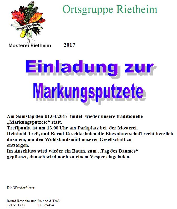 Markungsputzete und „Tag des Baumes“ Sa., 01.04.2017, Münsingen/Rietheim Uhrzeit: 00:00 Ort: Mosterei Münsinger Straße 58 72525 Münsingen/Rietheim iCalendar Mit dem Laden der Karte akzeptieren Sie die Datenschutzerklärung von Google.Mehr erfahren Karte laden Google Maps immer entsperren zur Übersicht