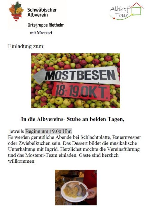 Mostbesen 18. + 19. Okt 2019 19:00 Uhr Fr., 18.10.2019, Münsingen/Rietheim Uhrzeit: 00:00 Ort: Mosterei Münsinger Straße 58 72525 Münsingen/Rietheim iCalendar Mit dem Laden der Karte akzeptieren Sie die Datenschutzerklärung von Google.Mehr erfahren Karte laden Google Maps immer entsperren zur Übersicht