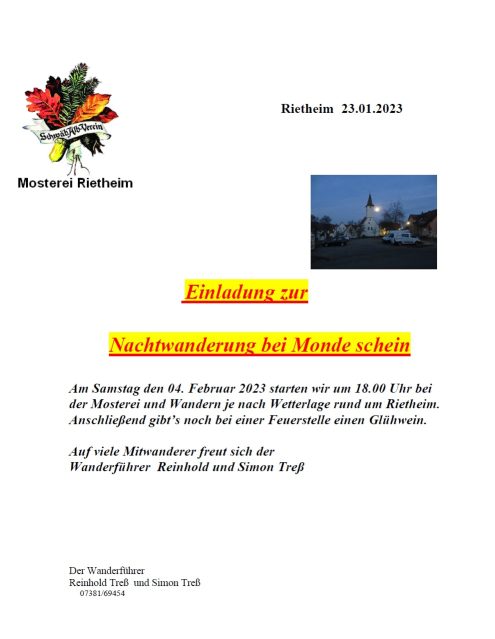 Nachtwanderung Sa., 04.02.2023, Münsingen/Rietheim Uhrzeit: 00:00 Ort: Mosterei Münsinger Straße 58 72525 Münsingen/Rietheim iCalendar Mit dem Laden der Karte akzeptieren Sie die Datenschutzerklärung von Google.Mehr erfahren Karte laden Google Maps immer entsperren zur Übersicht