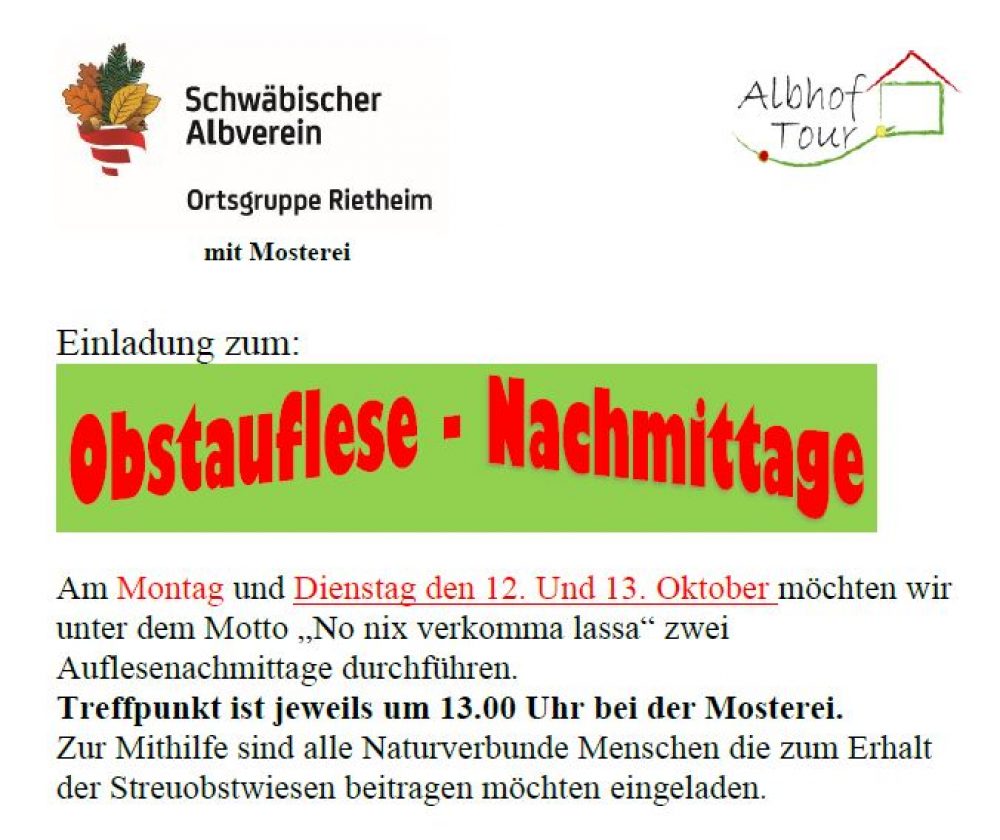 Obstspende und Obstauflesetag 13:00 Uhr Mo., 12.10.2020, Münsingen/Rietheim Uhrzeit: Ganztägig Ort: Mosterei Münsinger Straße 58 72525 Münsingen/Rietheim iCalendar Mit dem Laden der Karte akzeptieren Sie die Datenschutzerklärung von Google.Mehr erfahren Karte laden Google Maps immer entsperren zur Übersicht