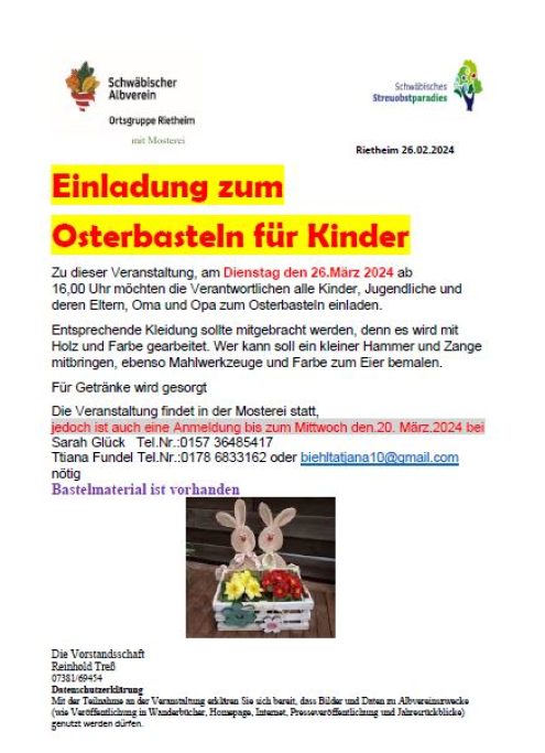 Osterbasteln für Kinder ab 16:00 Uhr Di., 26.03.2024, Münsingen/Rietheim Uhrzeit: 00:00 Ort: Mosterei Münsinger Straße 58 72525 Münsingen/Rietheim iCalendar Mit dem Laden der Karte akzeptieren Sie die Datenschutzerklärung von Google.Mehr erfahren Karte laden Google Maps immer entsperren zur Übersicht