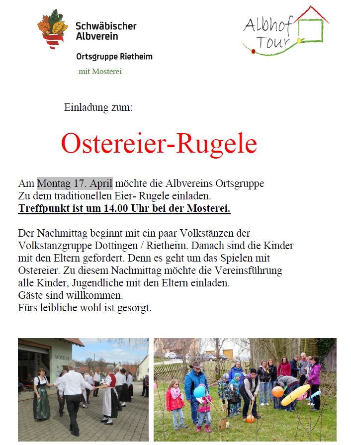 Ostereier rugla Mo., 17.04.2017, Münsingen/Rietheim Uhrzeit: 00:00 Ort: Mosterei Münsinger Straße 58 72525 Münsingen/Rietheim iCalendar Mit dem Laden der Karte akzeptieren Sie die Datenschutzerklärung von Google.Mehr erfahren Karte laden Google Maps immer entsperren zur Übersicht