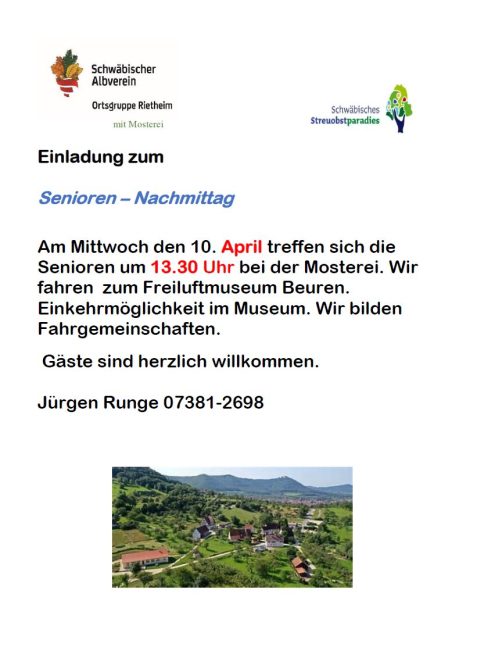 Senior-Nachmittag 13:30 Uhr Mi., 10.04.2024, Münsingen/Rietheim Uhrzeit: 00:00 Ort: Mosterei Münsinger Straße 58 72525 Münsingen/Rietheim iCalendar Mit dem Laden der Karte akzeptieren Sie die Datenschutzerklärung von Google.Mehr erfahren Karte laden Google Maps immer entsperren zur Übersicht
