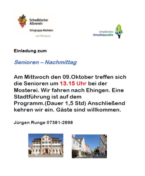 Senioren-Nachmittag 13:15 Uhr Mi., 09.10.2024, Münsingen/Rietheim Uhrzeit: 00:00 Ort: Mosterei Münsinger Straße 58 72525 Münsingen/Rietheim iCalendar Mit dem Laden der Karte akzeptieren Sie die Datenschutzerklärung von Google.Mehr erfahren Karte laden Google Maps immer entsperren zur Übersicht