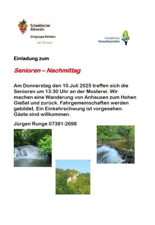 Senioren-Nachmittag 13:30 Uhr Do., 10.07.2025, Münsingen/Rietheim Uhrzeit: 00:00 Ort: Mosterei Münsinger Straße 58 72525 Münsingen/Rietheim iCalendar Mit dem Laden der Karte akzeptieren Sie die Datenschutzerklärung von Google.Mehr erfahren Karte laden Google Maps immer entsperren zur Übersicht