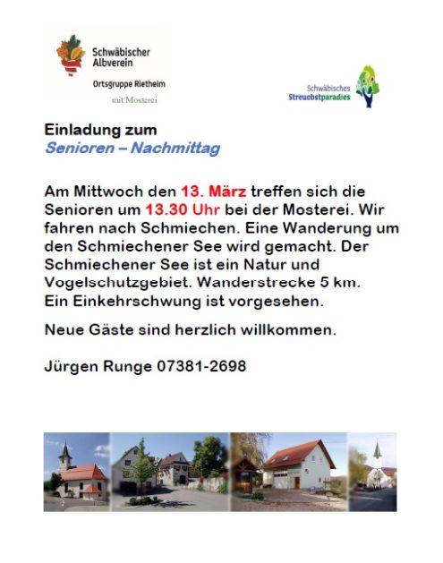 Senioren—Nachmittag 13:30 Uhr Mi., 13.03.2024, Münsingen/Rietheim Uhrzeit: 00:00 Ort: Mosterei Münsinger Straße 58 72525 Münsingen/Rietheim iCalendar Mit dem Laden der Karte akzeptieren Sie die Datenschutzerklärung von Google.Mehr erfahren Karte laden Google Maps immer entsperren zur Übersicht