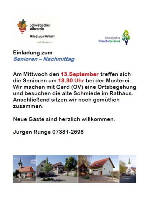 Senioren-Nachmittag 13:30 Uhr Mi., 13.09.2023, Münsingen/Rietheim Uhrzeit: 00:00 Ort: Mosterei Münsinger Straße 58 72525 Münsingen/Rietheim iCalendar Mit dem Laden der Karte akzeptieren Sie die Datenschutzerklärung von Google.Mehr erfahren Karte laden Google Maps immer entsperren zur Übersicht