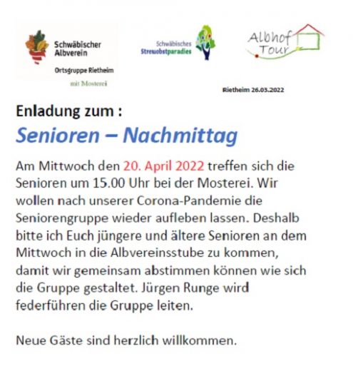 Senioren-Nachmittag 15:00 Uhr Mi., 20.04.2022, Münsingen/Rietheim Uhrzeit: 00:00 Ort: Mosterei Münsinger Straße 58 72525 Münsingen/Rietheim iCalendar Mit dem Laden der Karte akzeptieren Sie die Datenschutzerklärung von Google.Mehr erfahren Karte laden Google Maps immer entsperren zur Übersicht