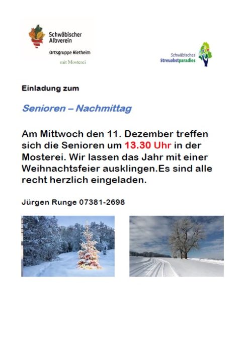 Senioren-Nachmittag 13:30 Uhr Mi., 11.12.2024, Münsingen/Rietheim Uhrzeit: 00:00 Ort: Mosterei Münsinger Straße 58 72525 Münsingen/Rietheim iCalendar Mit dem Laden der Karte akzeptieren Sie die Datenschutzerklärung von Google.Mehr erfahren Karte laden Google Maps immer entsperren zur Übersicht