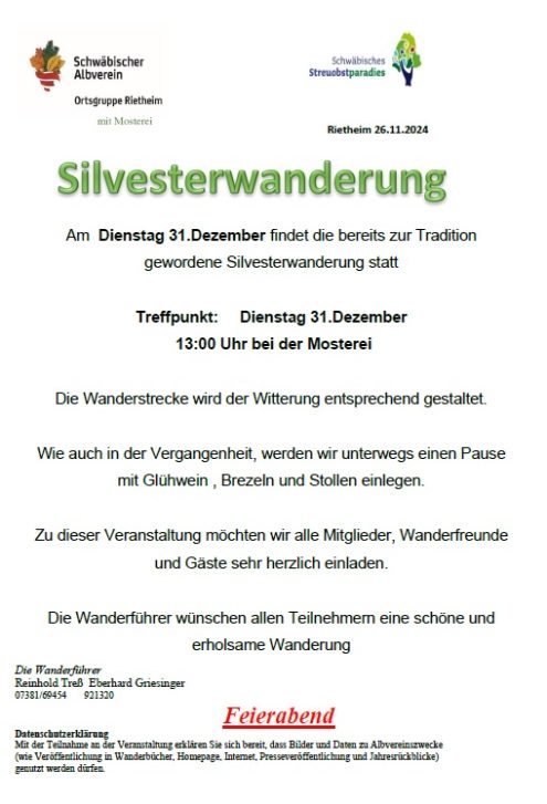 Silvesterwanderung 13:00 Uhr Di., 31.12.2024, Münsingen/Rietheim Uhrzeit: 00:00 Ort: Mosterei Münsinger Straße 58 72525 Münsingen/Rietheim iCalendar Mit dem Laden der Karte akzeptieren Sie die Datenschutzerklärung von Google.Mehr erfahren Karte laden Google Maps immer entsperren zur Übersicht