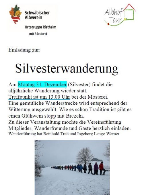 Silvesterwanderung Mo., 31.12.2018, Münsingen / Rietheim Uhrzeit: 00:00 Ort: Albvereins-Stube / Mosterei Münsingerstr.58 72525 Münsingen / Rietheim iCalendar Mit dem Laden der Karte akzeptieren Sie die Datenschutzerklärung von Google.Mehr erfahren Karte laden Google Maps immer entsperren zur Übersicht