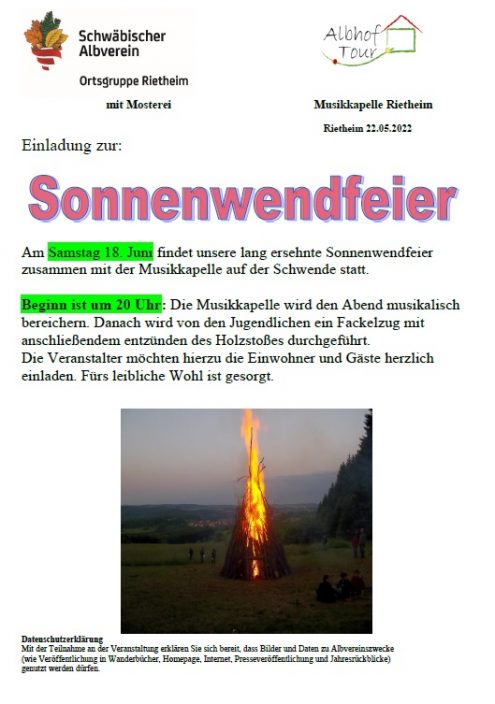 Sonnwendfeier 20:00 Uhr Sa., 18.06.2022, Rietheim Uhrzeit: Ganztägig Ort: Schwende Sirchingerweg 72525 Rietheim iCalendar Mit dem Laden der Karte akzeptieren Sie die Datenschutzerklärung von Google.Mehr erfahren Karte laden Google Maps immer entsperren zur Übersicht