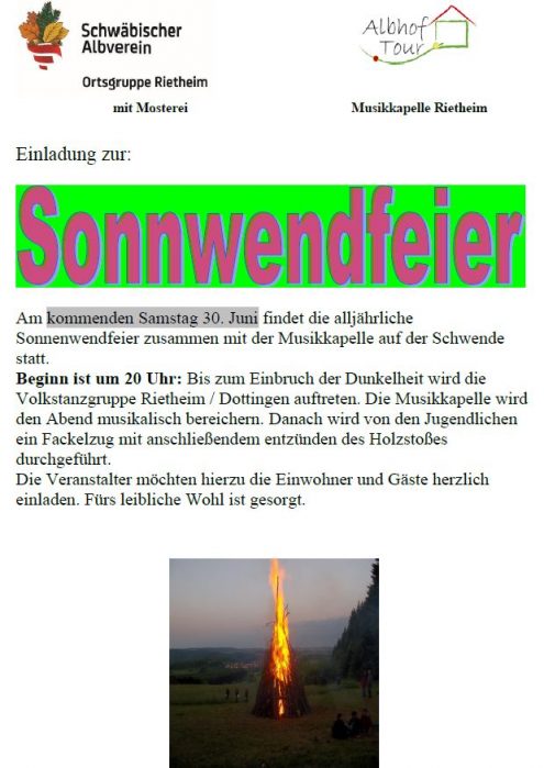 Sonnwendfeier Sa., 30.06.2018, Rietheim Uhrzeit: 00:00 Ort: Schwende Sirchingerweg 72525 Rietheim iCalendar Mit dem Laden der Karte akzeptieren Sie die Datenschutzerklärung von Google.Mehr erfahren Karte laden Google Maps immer entsperren zur Übersicht