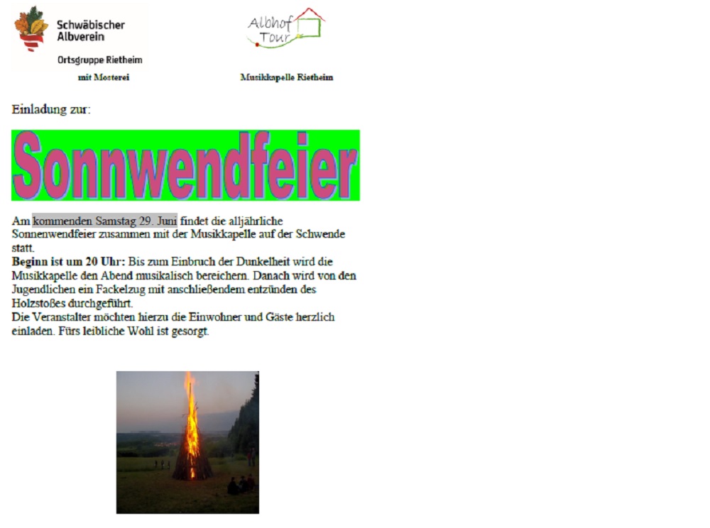Sonnwendfeier Sa., 29.06.2019, Rietheim Uhrzeit: 00:00 Ort: Schwende Sirchingerweg 72525 Rietheim iCalendar Mit dem Laden der Karte akzeptieren Sie die Datenschutzerklärung von Google.Mehr erfahren Karte laden Google Maps immer entsperren zur Übersicht
