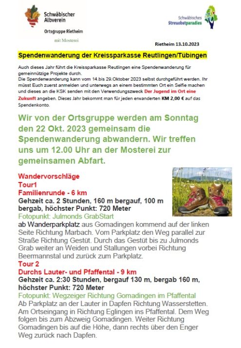 Spendenwanderung So., 22.10.2023, Münsingen/Rietheim Uhrzeit: 00:00 Ort: Mosterei Münsinger Straße 58 72525 Münsingen/Rietheim iCalendar Mit dem Laden der Karte akzeptieren Sie die Datenschutzerklärung von Google.Mehr erfahren Karte laden Google Maps immer entsperren zur Übersicht
