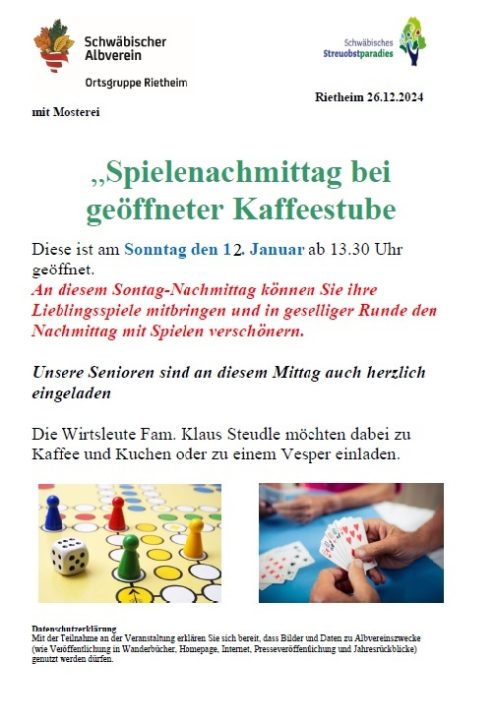 Spiele Nachmittag 13:30 Uhr So., 12.01.2025, Münsingen / Rietheim Uhrzeit: 00:00 Ort: Albvereins-Stube / Mosterei Münsingerstr.58 72525 Münsingen / Rietheim iCalendar Mit dem Laden der Karte akzeptieren Sie die Datenschutzerklärung von Google.Mehr erfahren Karte laden Google Maps immer entsperren zur Übersicht